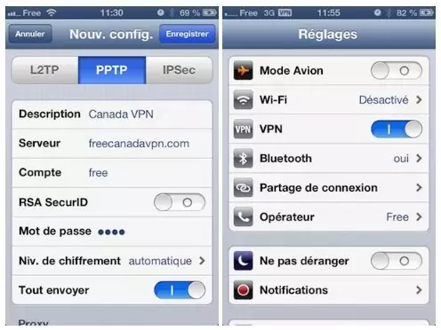 Une fois le mot de passe inséré et la configuration enregistrée, activez le VPN. Un logo VPN s’inscrit dans la barre de statut en haut de l’écran, indiquant le fonctionnement en cours de votre VPN.