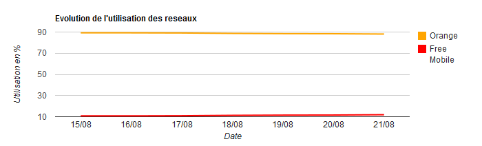 Grâce aux données partagées par l’ensemble de la communauté d’utilisateurs, l’application permet aussi de suivre au quotidien l’évolution de l’utilisation des réseaux Free Mobile et Orange.
