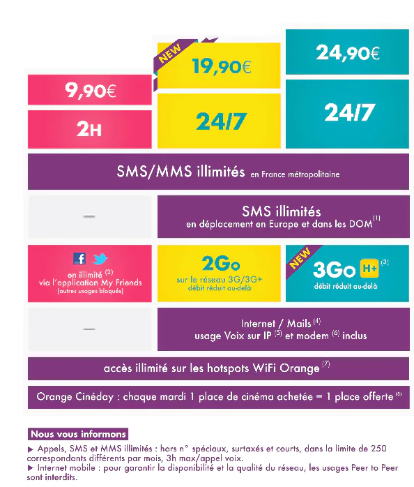 Pour le reste de sa gamme, l’opérateur ajoute le forfait à 19,90€ comprenant les appels 24/7, Internet 2Go, SMS/MMS illimités et SMS illimités depuis l’Europe. Cette dernière offre s’aligne clairement sur Free Mobile et BandYou. Certes, Orange propose 2Go de data mais offre les SMS illimités en déplacement en Europe et dans les DOM et le service Cineday.