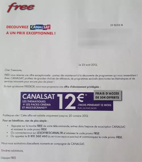 Free et Canalsat envoient un courrier aux Freenautes pour leur annoncer une offre privilège