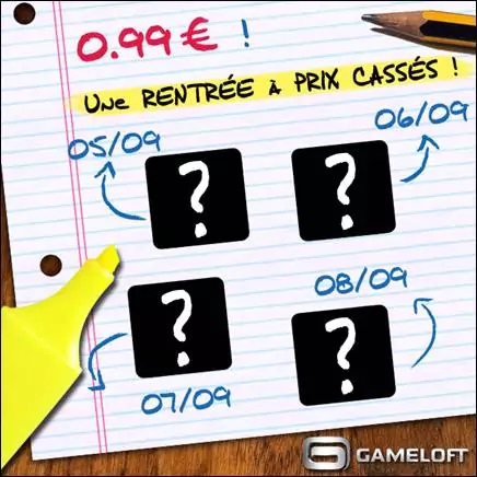 A l’occasion de la rentrée, Gameloft nous informe qu’il lance dés demain « La Rentrée à Prix Cassés ! » sur le Freestore. Chaque jour à partir du 5 septembre, un jeu Gameloft passera au prix de 0.99€ pour une durée limitée sur le Freestore ! Le titre du jeu et l’heure de la promotion seront révélés chaque jour sur le Twitter de Gameloft France http://twitter.com/Gameloft_france