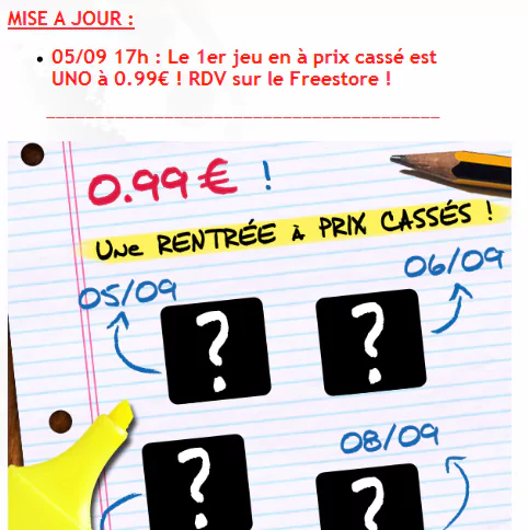 A l’occasion de la rentrée, Gameloft lance dés aujourd’hui « La Rentrée à Prix Cassés ! » sur le Freestore. Chaque jour à partir du 5 septembre, un jeu Gameloft passera au prix de 0.99€ pour une durée limitée sur le Freestore ! Le titre du jeu et l’heure de la promotion seront révélés chaque jour sur le Twitter de Gameloft France http://twitter.com/Gameloft_france