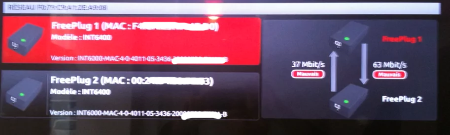 L’interface proposée référence les freeplugs connectés à votre réseau sur la gauche et montre le débit de transmission entre ceux-ci à droite. Dans notre cas, la réception et l’émission est mauvaise. Pour une réception de qualité, les valeurs doivent approcher 100 à 150Mbit/s.