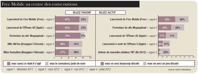 Et c’est presque sans surprise que l’on retrouve Free Mobile en tête du buzz actif (ceux qui ont participé au buzz) et du buzz passif (ceux qui en ont juste entendu parler), devançant même Apple, la référence dans ce domaine. « Le lancement de Free Mobile constitue l’événement le plus marquant de ces six premiers mois d’observation. Il arrive en tête du buzz passif, et domine de manière encore plus marquée le buzz actif. Preuve qu’il s’agit d’une révolution du secteur » a commenté Aurélie Gibiat, la directrice technologies, media, télécoms et Entertainment de Harris Interactive.