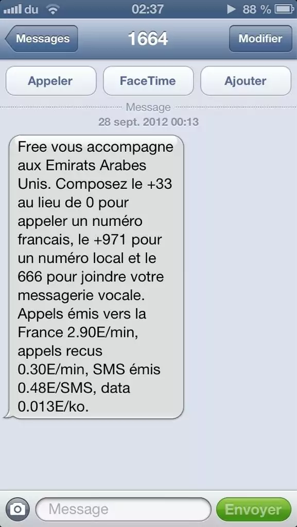 Free Mobile envoie désormais un SMS de bienvenue à l’étranger, avec les tarifs du pays