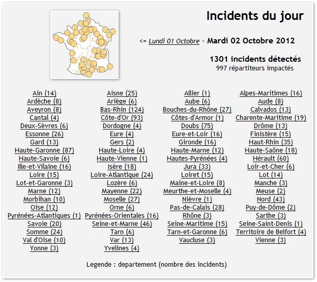 Cette nuit, 1301 incidents ont été détectés par Free-réseau, le site de suivi de l’état du réseau Free. Ces incidents ont été localisés sur 997 DSLAM Free. Une énorme partie des départements ont cessé de répondre, privant ainsi des dizaines de milliers de Freenautes de leur connexion ADSL dans l’Ain, l’Aisne, l’Allier, les Alpes-Maritimes, la Moselle, les Pyrénées-Orientales, la Seine-et-Marne, la seine-Saint-Denis (et dans des dizaines d’autres départements).