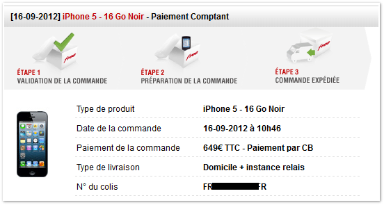 Comme annoncé par Free, des commandes d’iPhone ont bien été expédiées depuis hier et reçues ce 1er octobre. Sauf que, contrairement à ce qu’avait indiqué l’opérateur, ce ne sont pas les iPhones pré-commandés à partir du 19 septembre, mais ceux qui l’ont été avant. Selon vos témoignages, les iPhones 5 reçus ce jour ont été commandés les 14, 15 voire 16 septembre. Et encore, cela ne concerne qu’une petite partie des pré-commandes effectuées à ces dates.