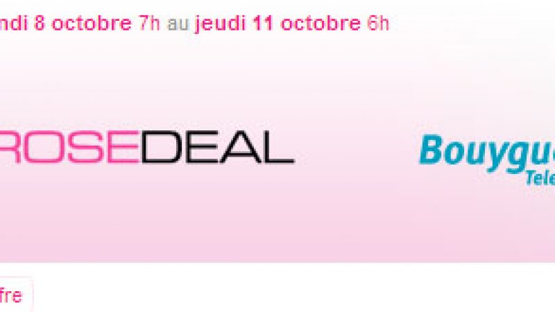 Depuis ce matin, et jusqu’au 11 octobre, une offre Bouygues Télécom est disponible sur Vente-Privée. L’opérateur y propose un bon Rosedeal d’une valeur de 100€ au prix de 20€, valable sur l’achat d’un mobile dans le cadre de la souscription à un nouveau forfait mobile ou d’un renouvellement de votre abonnement avec engagement de 12 mois minimum dans l’ensemble des 650 magasins Club Bouygues Telecom ou sur www.laboutique.bouyguestelecom.fr (pour les nouvelles souscriptions uniquement). Cette offre n’est pas valable avec les formules sans engagement et les recharges prépayées. Cela permet donc d’obtenir une réduction de 80 euros sur l’achat d’un Smartphone, à condition de s’engager avec un forfait.