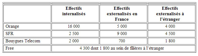 Le recours à l’externalisation est en augmentation constante en raison de la volonté des entreprises de recentrer leurs activités autour de leur cœur de métier et de la différence de coût très significative, de l’ordre de 70 € de l’heure pour un salarié en interne contre 25 à 28 € au sein d’un centre d’appel externalisé. Et en ce domaine, Free se démarque de ses concurrents en ayant 100% des emplois internalisés dans ses centres d’appels. Cela coute donc beaucoup plus cher à l’opérateur mais le service rendu aux abonnés et par définition meilleur (ce qui explique la première place de la relation client obtenue par Free Mobile). En effet, les conseillers chez les sous-traitants sont souvent amenés à passer d’une activité à une autre (ils peuvent passer de SFR à la Redoute par exemple) avec donc une culture d’entreprise sous-traitants et non opérateur. Là où chez Free tout le monde dispose de la même formation, partage les mêmes objectifs, des possibilités de promotion interne et où chacun participe aux résultats de l’entreprise. C’est un élément différenciant important.