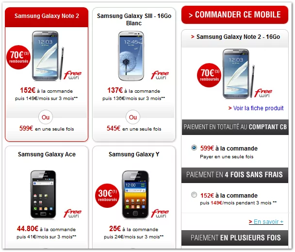 Concernant le paiement à crédit, le Galaxy Note II est proposé à 1€ à la commande puis :