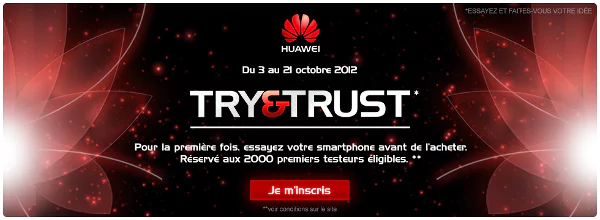 Alors qu’énormément de regards sont fixés sur le duel Samsung-Apple, Huawei organise du 03 au 21 octobre 2012, une opération sans obligation d’achat intitulée, « Try and Trust », Limitée à 2000 participants, l’opération offre la possibilité d’essayer pendant 10 jours l’un des trois smartphones de la marque : « Ascend P1 », « Honour » ou « Ascend G300 ». Passé ce délai, Huawei vous propose d’acheter à tarif préférentiel le téléphone ou de le retourner sans frais (à la charge d’Huawei).