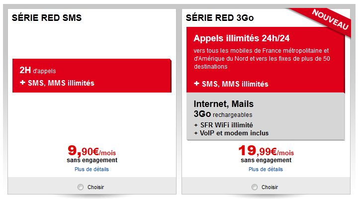 SFR a, une nouvelle fois, revu et corrigé les offres sans engagement de la Serie RED. Une refonte en profondeur des forfaits qui passent de trois offres à deux : « Serie RED SMS » à 9,90 euros/mois et « Série RED 3Go » à 19,99 €/mois. Les offres dites « Série RED 500Mo » et « Série RED 1 Go » disparaissent.