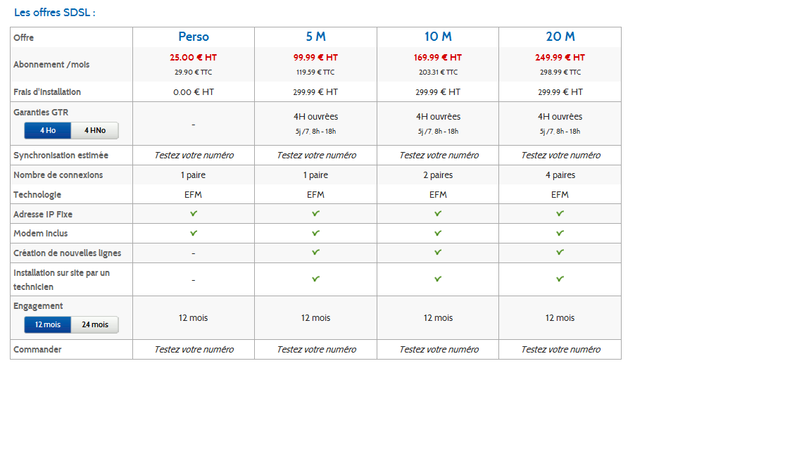 Les Offres SDSL 5M, 10M et 20M ont des frais d’installation de 299,99 euros Hors Taxes avec un engagement de 12 mois qui descendent à 99 euros pour un engagement de 24 mois. Les tarifs varient de 99 euros HT à 349 euros HT en fonction de la garantie de rétablissement choisie (4 heure ouvrées ou non ouvrées).