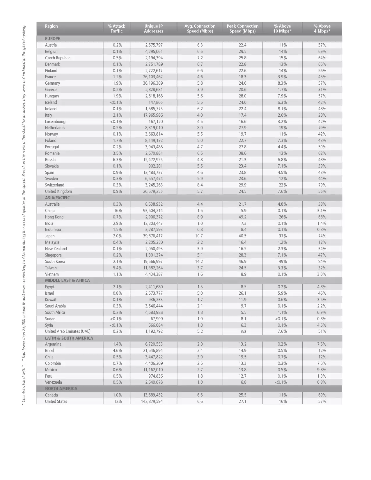 Au deuxième trimestre 2012, la France comptait 26,1 millions d’adresses IP, représentant à elles seules 1,2% du trafic internet mondial. La vitesse moyenne de connexion y était de 4,6Mbps, ce qui est relativement faible au niveau européen, où seuls la Grèce (3,9Mbps), l’Italie (4Mbps) et le Luxembourg (4,5Mbps) présentent des statistiques plus faibles.