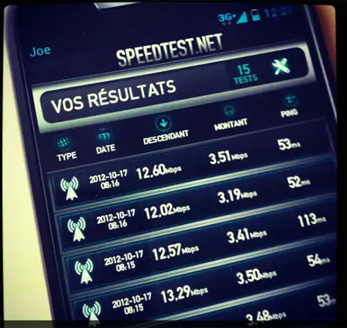Joe Mobile, le MVNO que lancera SFR le 23 octobre, continue à faire monter le buzz. Et il tacle directement Free Mobile en sous entendant que les débits seront très importants. Rien n’est annoncé clairement et donc cela n’engage pas l’opérateur, mais le compte Twitter de Joe Mobile publie une capture montrant des mesures de débit et en indiquant « Joe ne restera pas coincé dans les embouteillages ».
