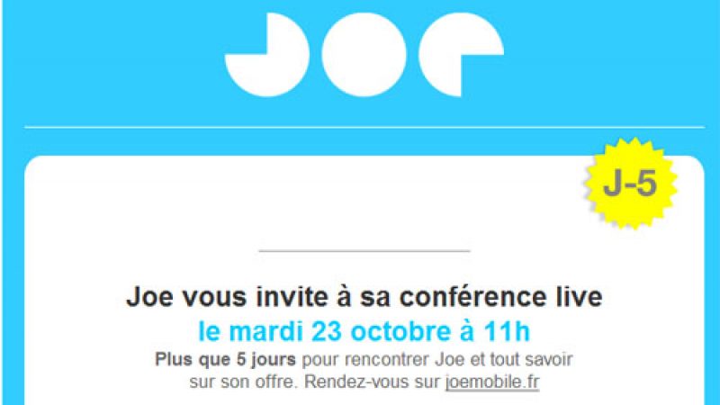 Et la similitude ira même jusque dans la forme de l’annonce des offres puisque Joe Mobile envoie actuellement un mail pour informer qu’il organise une conférence de lancement, qui sera retransmise en live sur Internet. Même si Free n’est bien sur pas l’inventeur de ce type de conférence, c’était jusqu’ici le seul en France à avoir procédé de la sorte pour présenter ses offres mobile, les autres opérateurs se contentant généralement d’un communiqué de presse.
