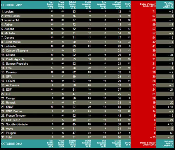 Chaque trimestre, La Matrice réalise avec Ipsos, un baromètre sur l’mage qu’ont les grandes entreprises françaises auprès du grand public. Ce baromètre est réalisé à partir d’un sondage qualitatif, qui a été réalisé cette fois-ci les 5 et 6 octobre 2012 sur un échantillon national représentatif de la population française, composé de 966 personnes âgées de 18 ans et plus. Il en découle un indice d’image correspondant à la différence entre le % des interviewés déclarant avoir une bonne image et le % des interviewés déclarant avoir une mauvaise image de l’entreprise.