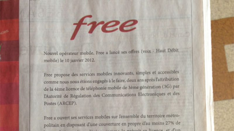 Free Mobile s’offre une pub dans un journal pour informer du déploiement d’antennes 3G