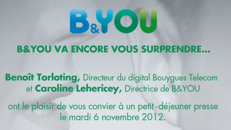 Cette conférence sera animée par Benoît Torloting, Directeur du digital Bouygues Telecom et Caroline Lehericey, Directrice de B&YOU. Il n’y a que peut d’indices sur les annonces qui vont être faites, mais l’invitation indique "B&YOU va encore vous surprendre…". (Bouygues a au moins l’originalité de ne pas utilisé le terme « révolution » qui est employé à tout bout de champ en ce moment). Rendez-vous le 6 novembre donc pour en savoir plus…