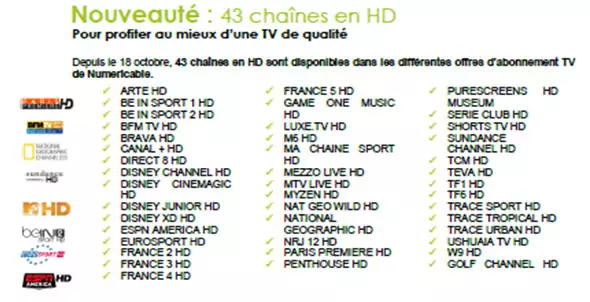 Numéricable annonce avoir ajouté ce mois-ci plus d’une dizaine de chaînes en haute définition à son bouquet ce qui porte à 43 le nombre total de chaînes HD disponibles.