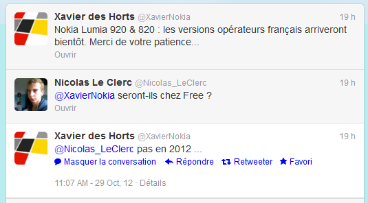 Les smartphones Nokia Lumia 820 et 920 seront proposés très prochainement par tous les opérateurs sauf Free Mobile. C’est du moins ce que l’ont peut lire sur Twitter en consultant le compte de Xavier Des Horts, Manager chargé de la communication de Nokia en France. Nos confrères de PcInpact ont remarqué que ce dernier affirmait que les 2 nouvelles versions du Nokia Lumia ne seraient pas disponibles chez Free « en 2012 ».