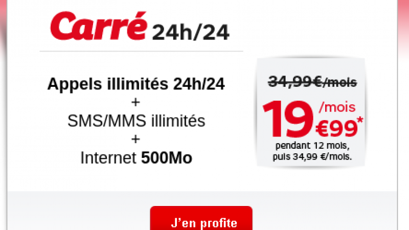 SFR a annoncé aujourd’hui et jusqu’au 19 novembre, qu’il alignait son forfait Carré sur le prix de la Serie Red à 19,99 €/mois pour les appels illimité 24/24, SMS/MMS illimités et internet 500 Mo.