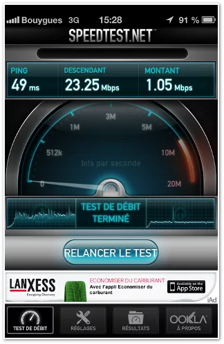 Certains risquent d’être déçus s’ils s’attendent à obtenir des débits élevés à chaque fois. Le débit moyen sur le réseau B&You (avec ou sans H+) est beaucoup moins important d’après les différents témoignages d’abonnés sur les forums : Entre 5 et 6 Mbit/s en download et 1 Mbit/s en upload avec un Blackberry Bold 9900 en région parisienne en utilisant Speedtest ces deux derniers jours (les débits sont aléatoires, tout dépend des performances du téléphone, de la saturation du réseau (ou pas), etc… Notons que lors de nos tests, le débit montant était bridé à 1 Mbit/s à chaque fois. En comparaison, nous obtenons 4,5 Mbit/s en download et 1,7 Mbit/s en upload avec une ligne Free Mobile (avec le même mobile et la même application). Les résultats sont corrects mais loin de ceux annoncés.