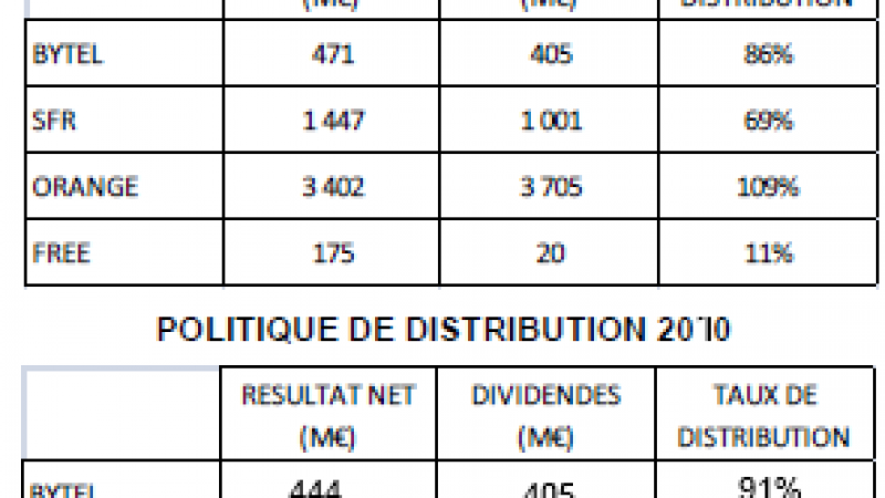 Même si la gauche dans son ensemble ne tient pas le même discours qu’Arnaud Montebourg ou la députée Corinne Erhel, sa position a de quoi étonner. En effet, paradoxalement, ces personnalités prennent position pour des entreprises dont le comportement est dénoncé par ailleurs, en distribuant de plantureux dividendes, au lieu d’investir dans l’économie et d’embaucher. Une attitude exactement inverse à celle de Free qui redistribue peu, ré-investit la plus grande partie de son bénéfice et, proportionnellement à son chiffre d’affaires, embauche plus que ses concurrents. @NeufCentMHz, sur Twitter, a réalisé un tableau récapitulatif du bénéfice et du dividende reversé par chacun des opérateurs sur les 3 dernières années. Les chiffres parlent d’eux-mêmes.