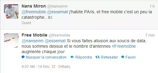 Même les nombreuses demandes d’information à ce sujet auprès du compte Twitter de Free Mobile n’obtenaient pas de réponse. Ce dernier semble maintenant prêt à communiquer sur ce problème puisqu’il vient d’indiquer, à propos des mauvais débits sur Paris « Si vous faites allusion aux soucis de data, nous sommes dessus et le nombre d’antennes Free Mobile augmente chaque jour »
