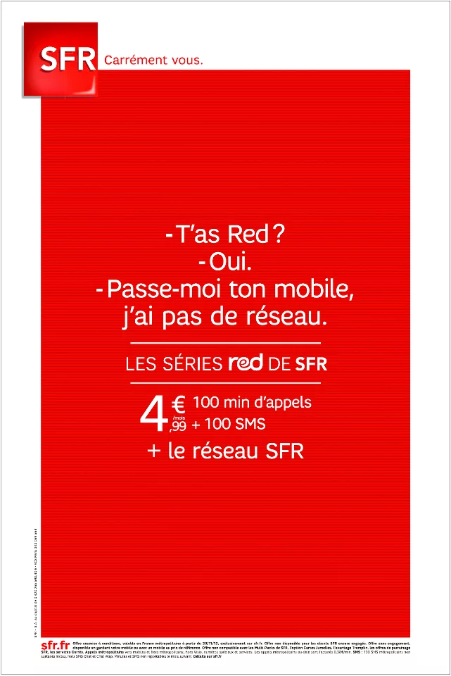 Nous vous l’annoncions ce matin, SFR a lancé un nouveau forfait, « Série RED 100 minutes » à 4,99€ comprenant 100 minutes d’appels et 100 SMS. L’opérateur profite de l’occasion pour diffuser sur les réseaux sociaux, une photo de son nouveau spot publicitaire. Jugez par vous-même :