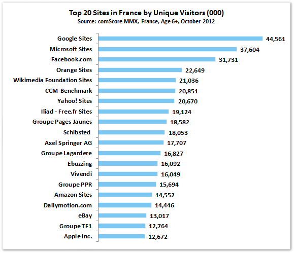 Comscore a publié le Top 20 des sites web les plus visités en France au mois d’octobre 2012. Les meilleurs (ennemis) prennent d’assaut le début et la fin du classement. En tête, Google domine avec 44,561 millions de visiteurs uniques et Apple est 20ème (12,672 millions). Le groupe Iliad (Free) arrive 8ème avec 19,124 millions de visiteurs uniques. Orange est 4ème (22,649 millions).