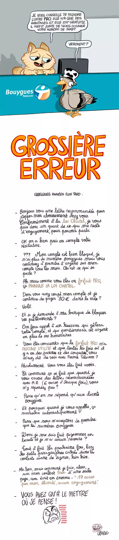 Clin d’oeil : Laurel propose de manière originale de découvrir sa mésaventure avec l’opérateur mobile, Bouygues Télécom. La blogueuse, un crayon dans le coeur, a publié un dessin résumant ses difficultés pour résilier son forfait Pro en utilisant la loi Châtel. « Je me suis fais pigeonner en beauté et je n’ai aucun recours ? […] Et pourquoi lorsque je vous appelle, ça raccroche automatiquement » s’interroge-t-elle ?