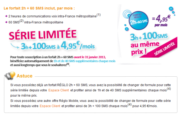 E-Leclerc mobile propose dès aujourd’hui une offre à 3h00 et 100 SMS à 4,95 €/ mois. Ce forfait se base sur les forfaits « reglo mobile » qui proposaient, depuis le 1er octobre, au même prix un forfait à 2 heures et 60 SMS. Il s’agit d’une offre limitée jusqu’au 31 janvier 2013, cette offre est par contre « valable à vie » (jusqu’à résiliation ou changement de formule)