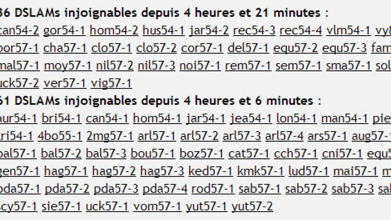 Depuis 4 heures maintenant, tous les Freenautes habitant au nord de la Lorraines sont privés de connexion. Cela concerne 97 DSLAM sur la Moselle (et particulièrement Metz), la Meurthe et Moselle et la Meuse.