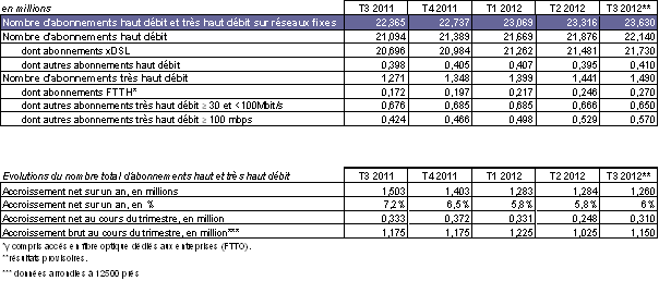 Le nombre d’abonnements haut débit est de 22,1 millions, soit une progression de 260 000 abonnements en un trimestre. Le nombre d’abonnements xDSL (21,7 millions à la fin du premier trimestre 2012) s’accroît de 250 000 en un trimestre, soit une contribution à la croissance nette totale de 80% environ. Le nombre des autres abonnements haut débit, c’est-à-dire les abonnements par le câble, en wifi, par le satellite ou la boucle locale radio (BLR), augmente également (+15 000), soit 410 000 accès à fin septembre 2012.