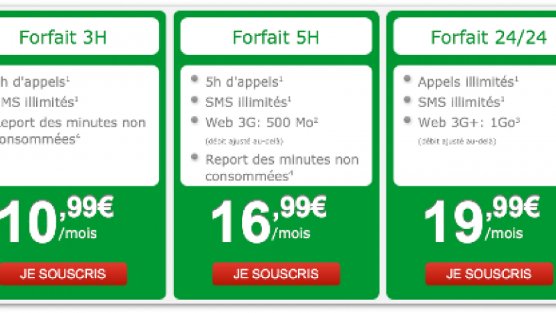 Notez que pour le forfait 5H avec 500Mo de DATA, le débit maximum théorique est de 384 kb/s (3G).