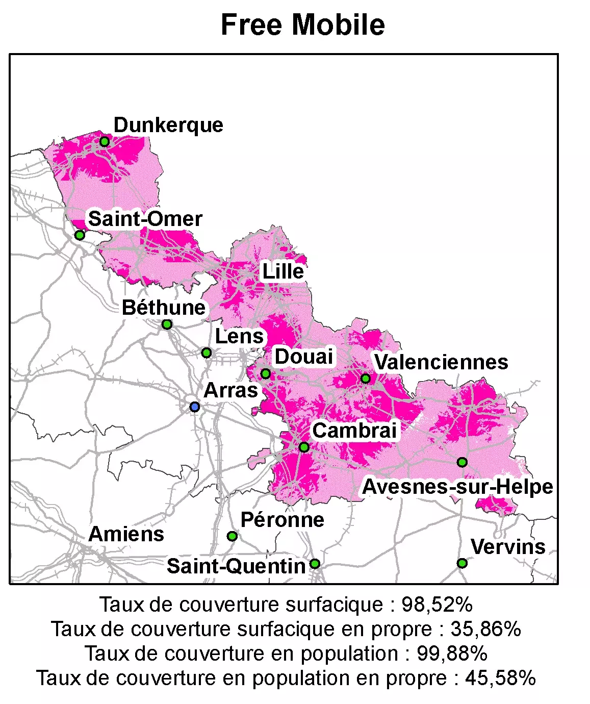 Les villes importantes de la région Nord-Pas de Calais bénéficient d’une couverture en réseau propre Free Mobile, représentant respectivement 35% et 23% du territoire et respectivement 45,5 et 31% de la population. Avec le contrat d’itinérance Orange c’est plus de 99% des abonnés Free qui bénéficient d’une couverture réseau.