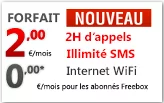 Free a musclé son forfait 2€ ! Il inclut désormais 2h d’appels vers les mobiles en France métropolitaine (+ USA, Canada) + les fixes de 40 destinations internationales dont la France Métropolitaine + les SMS illimités + Internet illimité sur réseau FreeWiFi. Le forfait est sans engagement ! Il est proposé au tarif de 2 € /mois ou 0 €/mois pour les abonnés Freebox !