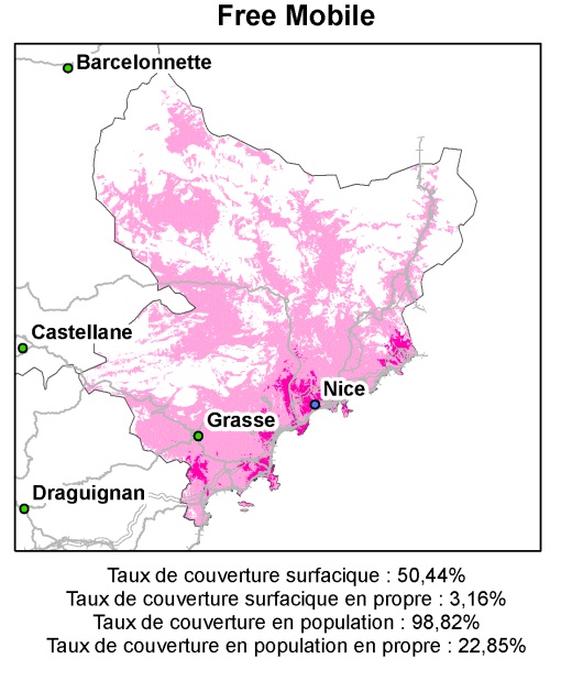 Au niveau du département Alpes-Maritimes, le réseau 3G de Free passant par les lignes d’Orange couvre environ 50% de la surface du département pour 98.82% de la population. Et aussi, le réseau 3G émis par les antennes Free couvre uniquement 3,16% pour environ 23% de la population du département. Le réseau de Nice est actif par les antennes Free et le réseau de Grasse passe par l’itinérance de Orange. 50% du département est couverte de zones blanches.