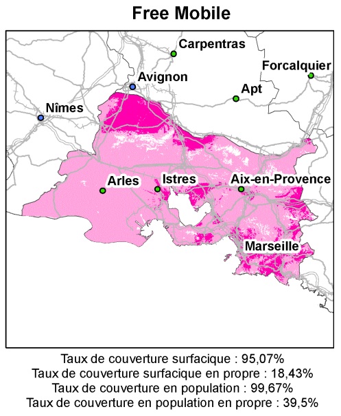Du côté des Bouches-du-Rhônes, le réseau 3G de Free passant par Orange recouvre 95,07% de la surface du département. Ainsi, environ 5% du département n’ont pas d’antennes. Les antennes émises par Free recouvrent plus d’un quart de la surface du département soit 18,43% pour juste 39.5% de la population. Le réseau de Marseille, Istres, Aix-en-Provence et au nord-ouest du département est actif par les antennes Free sinon pratiquement le reste du département est couvert par l’itinérance de Orange.