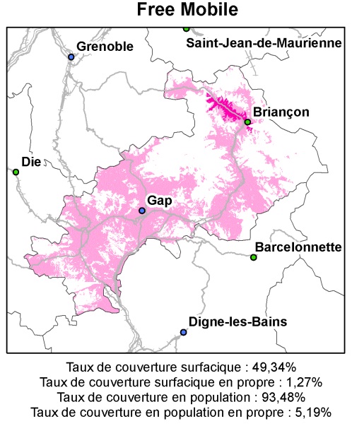 D’une part, le réseau 3G de Free passant par Orange couvre environ la moitié du département c’est-à-dire 49,34% pour 93,48% de la population mais l’autre moitié ne contient pas de réseau 3G. D’autre part, seulement 1,27 % de la surface du département Haute-Alpes est couvert par le réseau 3G émis par les antennes Free pour seulement 5.19% de la population. Le réseau 3G de Free est actif dans la ville de Briançon. Dans ce département, le réseau 3G est pitoyable, il y a plus de zones blanches que de couverture réseau 3G.