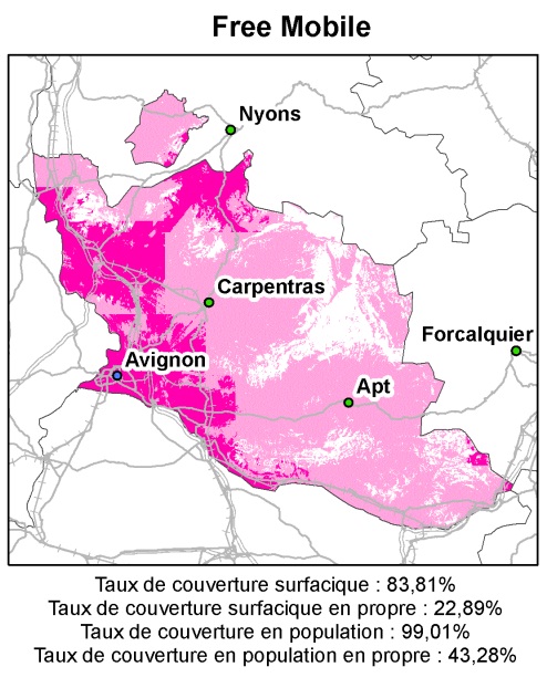 Dans le Vaucluse, le réseau 3G de Free passant par le réseau d’Orange est de 83,81% pour 99% de la population. Les antennes émises par Free recouvrent environ 23% du territoire pour 43.28% de la population. Le réseau 3G de Free est actif autour d’Avignon, à l’est et à l’ouest, et au nord-ouest. Il reste de nombreuses zones blanches et le reste du département passe par l’itinérance de Orange.