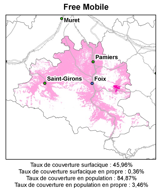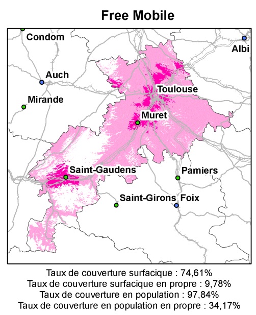 Dans la Haute-Garonne, les villes de Toulouse, Muret, Saint-Gaudens et leurs alentours bénéficient du réseau 3G de Free. Le reste du département peut accéder aux antennes d’Orange excepté quelques zones blanches à l’ouest.