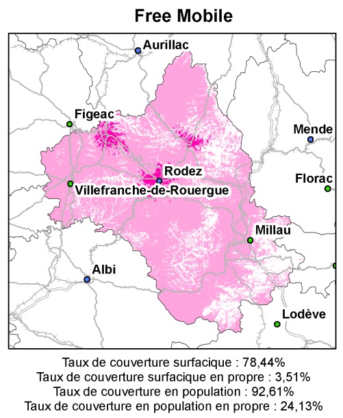 Le réseau de Free mobile occupe 3,51% de la surface du département et 24,13% de la population. C’est principalement la ville de Rodez qui en dispose. Le reste du département dispose du réseau d’Orange excepté les régions de l’est.
