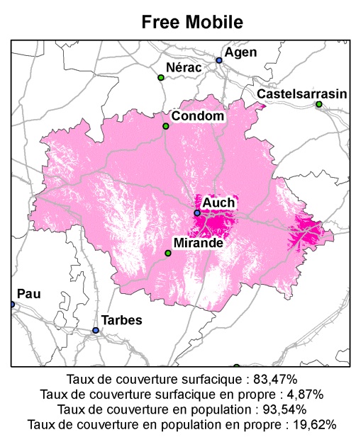 Dans ce département, la couverture du réseau de Free occupe 4,87% de la surface et 19,62% de la population. C’est les habitants de la ville d’Auch, ses alentours et une petite zone à l’est qui en bénéficient. Le reste de la population peux accéder aux antennes 3G d’Orange.