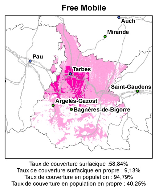 Le réseau Free mobile couvre 9,13% de la surface du département et se sont les habitants dans la zone de Tarbes qui en bénéficient. Les antennes d’Orange couvrent tout le reste du nord mais les montagnes du sud sont malheureusement très peu couvertes.