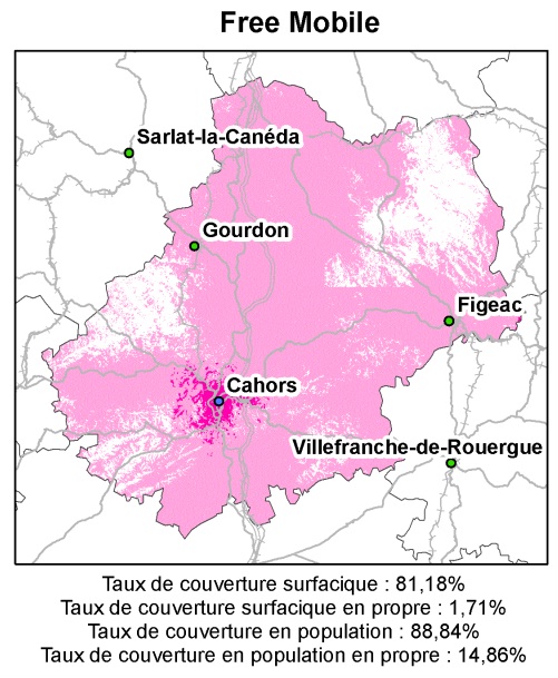 La ville de Cahors et ses alentours sont couverts par les antennes de Free ce qui représente 1,71% de la surface du département et 14,86% de la population. Le reste du département est sous le réseau d’Orange excepté quelques zones à l’ouest et au nord est.
