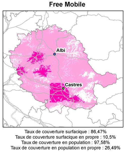 La ville de Castres, ses alentours et quelques zones à l’ouest sont sous les antennes de Free mobile. Soit 10,5% de la surface du département et 26,49% de sa population. Quand à Orange, son réseau couvre presque tout le reste de la population avec 97,58%.