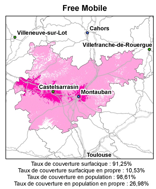 Le réseau 3G de Free couvre 10,53% de la surface et 26,98% de la population. Les villes de Castelsarrasin, Montauban et leurs alentours sont couvert. Le reste de la population accède aux antennes d’Orange à 98,61%.
