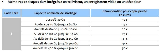Nos confrères de PC Inpact ont obtenu en exclusivité les futurs barèmes de la copie privée, qui seront votés le 14 décembre prochain. Parmi les supports qui sont taxés, se trouvent bien sûr les box qui disposent d’un disque dur. Si les grosses capacités sont moins frappées, la taxe des disques durs de 40 Go intégrés aux box passe de 10 à 12 euros. On peut noter également l’arrivée d’une nouvelle tranche pour les disques durs jusqu’à 8 Go, assujettie à une taxe de 6,30 euros. Selon les informations de PC Inpact « la Fédération Française des Télécoms, dernière représentante du collège des industrielles, a milité pour l’apparition de cette petite tranche. Cela permet d’anticiper des box embarquant peu de capacité de stockage avec pourquoi pas, un complément dans le cloud. »